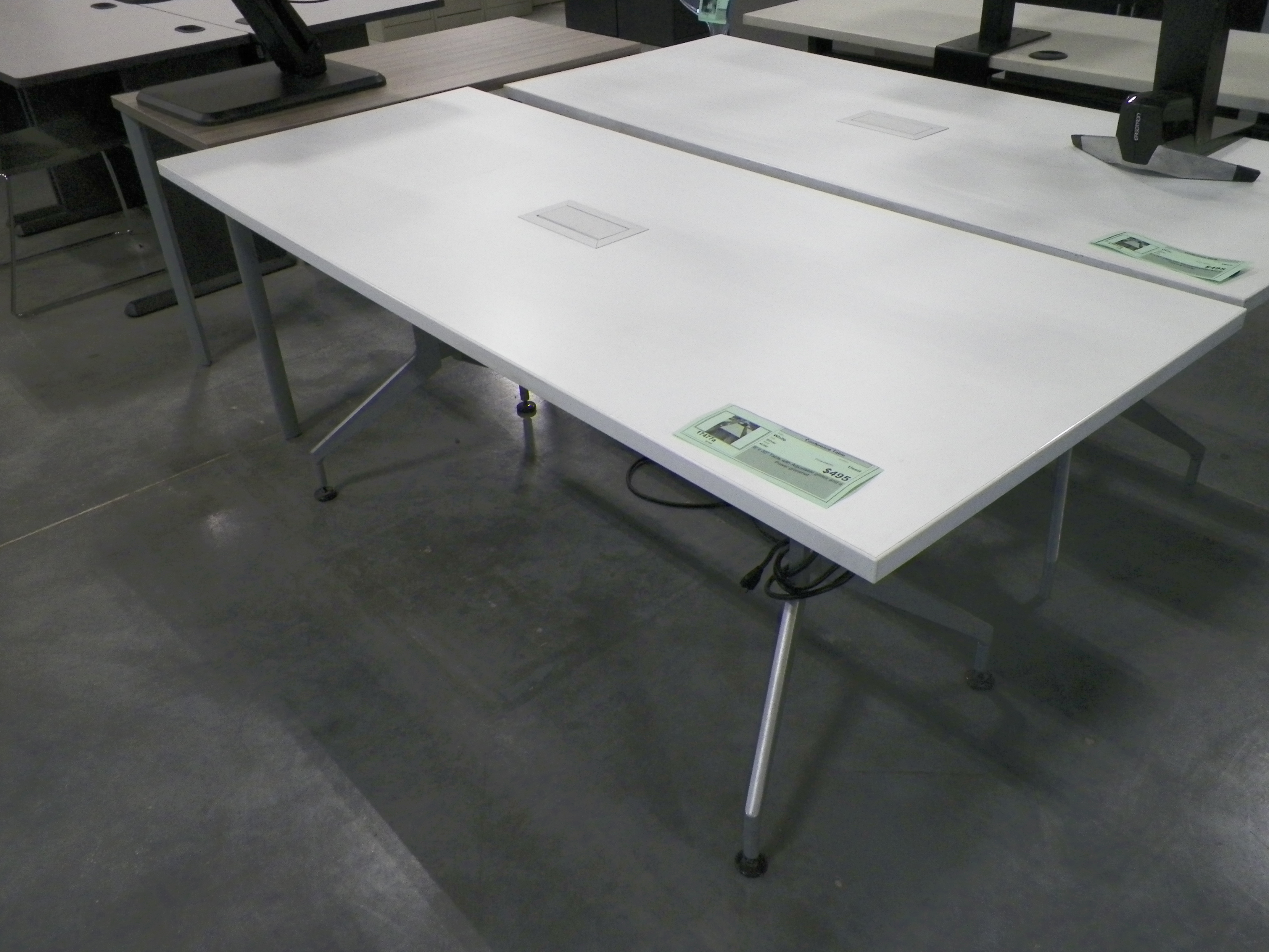 71x30 worktable/conference table, white top, silver base with built in power module. (Missing black leveling glides)