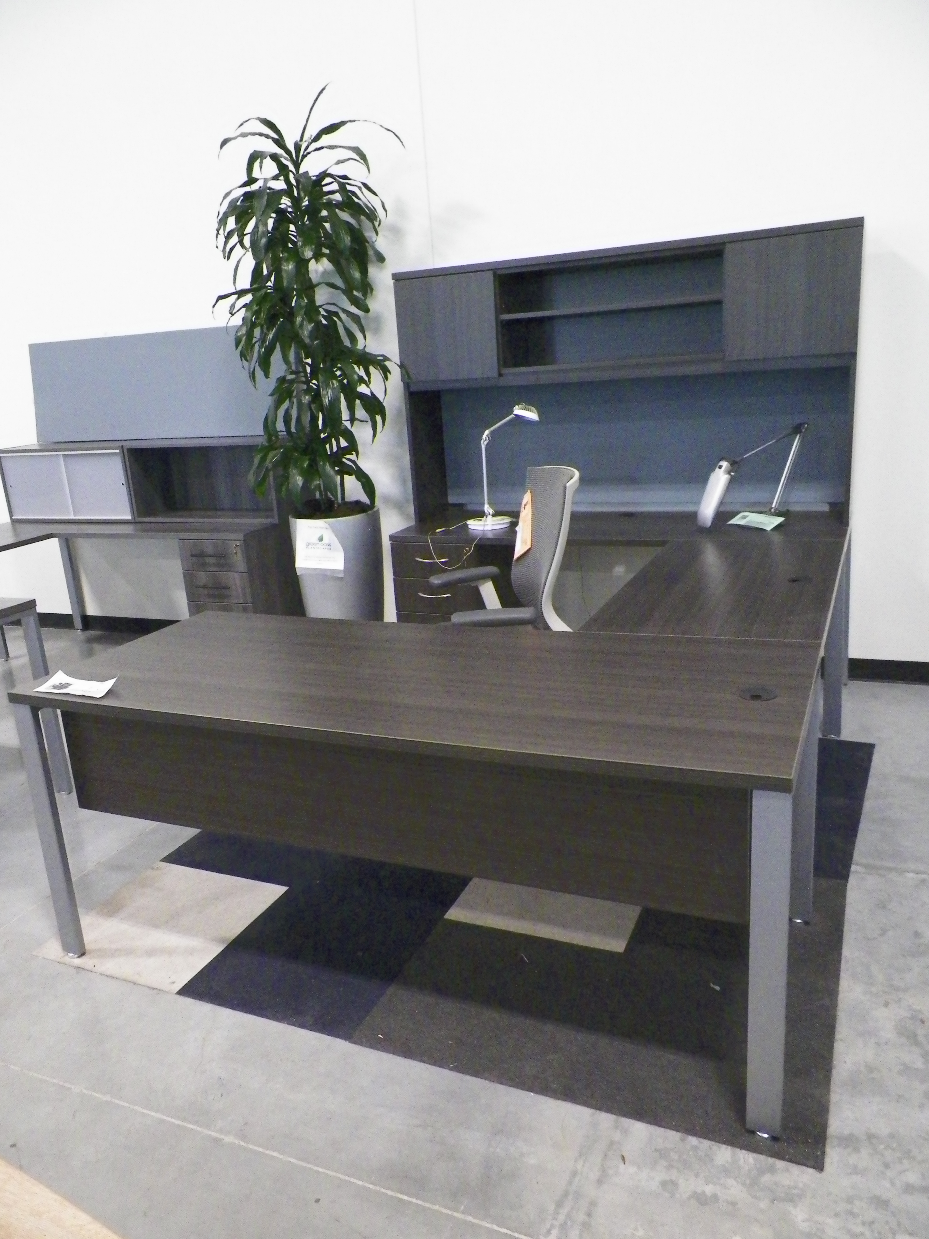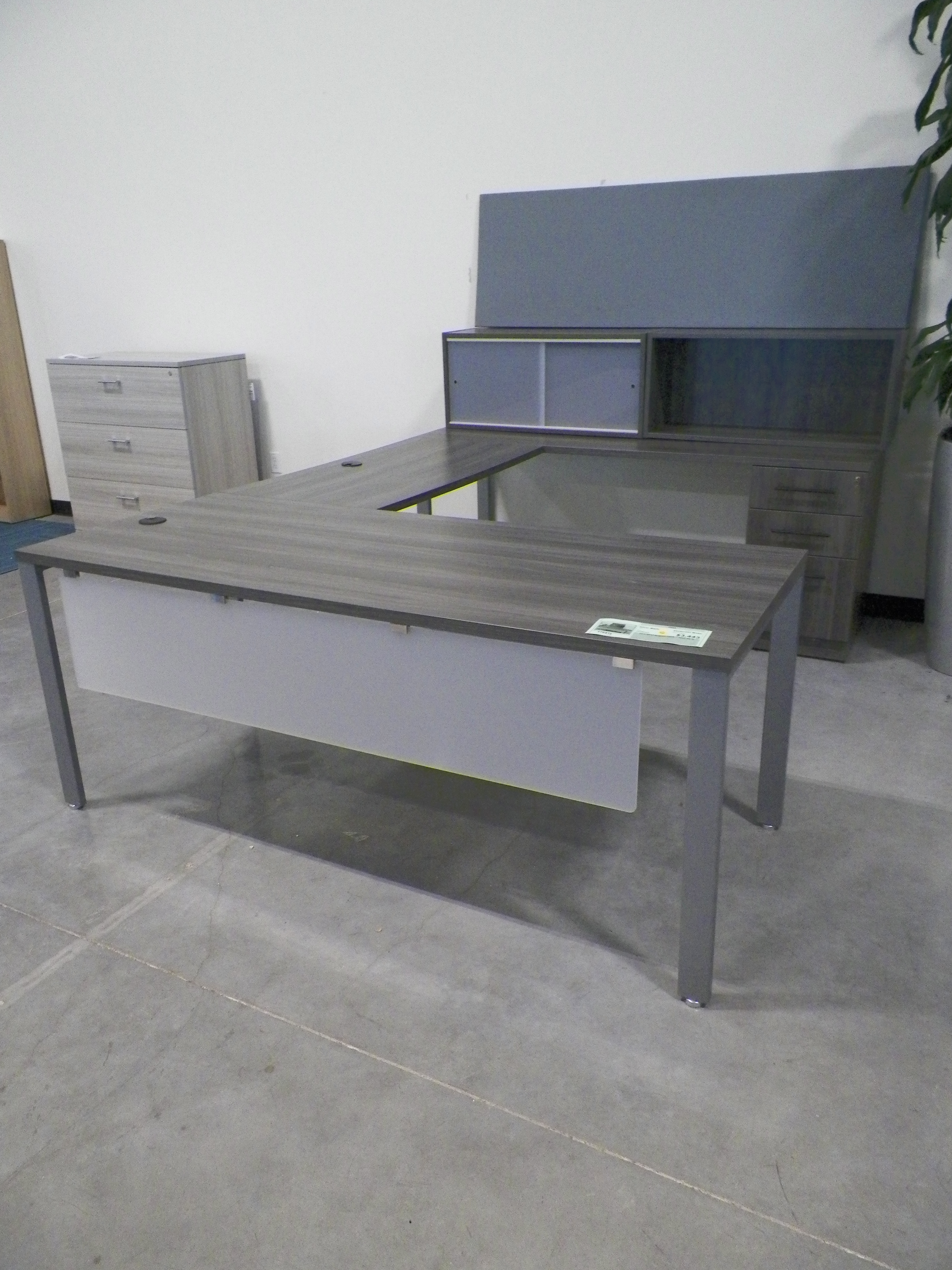 (1) mobile box/file pedestal, overhead hutch with laminate sliding door, and storage tower. CLOSEOUT.
