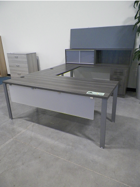 Metal Frame with frosted acrylic modesty panel, (1) box/box/file storage pedestal, Wall mount overhead storage, and wall mountable tack board. CLOSEOUT.