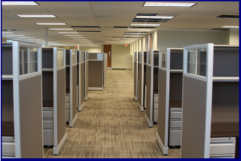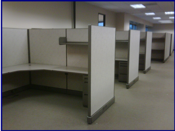 Herman Miller AO2 refurbished 6'X8' cubicle with frosted glass lexan topper, 2 overheads, 2 lights, 1 BBF Box box file cabinet, 1 FF file file cabinet per cubicle, powered.  COM choices in fabric, laminate, t-mold, metal trim color, all finishes chosen by designer for customer.  TOPS in turn re-furbished/remanufactured/re-painted, fabricated everything shown.
