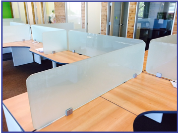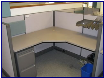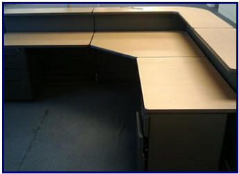 Use of new glass partitions mounted on used warm maple L shape desks with cubicle work surfaces and painted white legs and cabinets.  Customized length of desk but cutting one side in and re-trimming to correct length 6'X6' 6" to maximize the space.  Any used work surface can be used to make these desks.