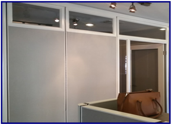 Same panel wall as photo to left only filled in to the ceiling. Refurbished Herman Miller panel wall with door, glass toppers custom height to 99"H, white trim, tan fabric.