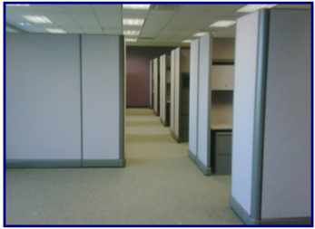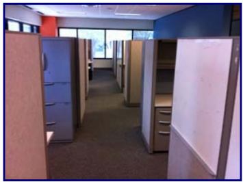 Pictured: Walkway through Herman Miller Refurbished Cubicles with clear lexan toppers and shown custom walnut laminate with 1 BBF box box file.