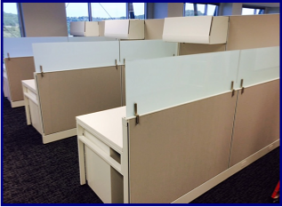 TOPS Refurbished Cubicle Inventory Innertone fabric, Medium tone trim, glass toppers added, Herman Miller AO2.