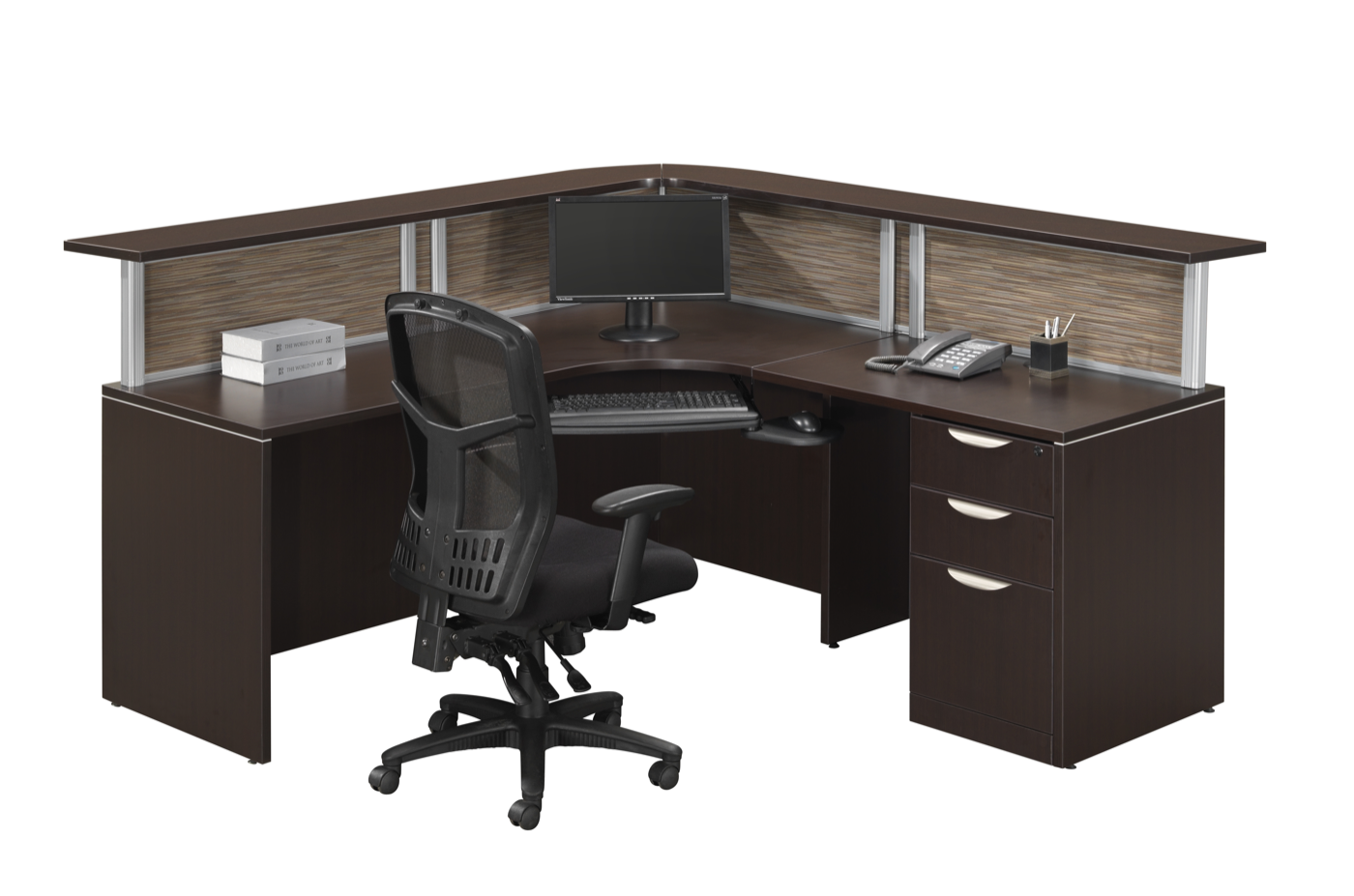 NEW RECEPTION EXTENDED CORNER CREDENZA DESK W/BORDERS PRIVACY & FULL TRANSACTION TOP, WITH OPTIONAL KEYBOARD TRAY